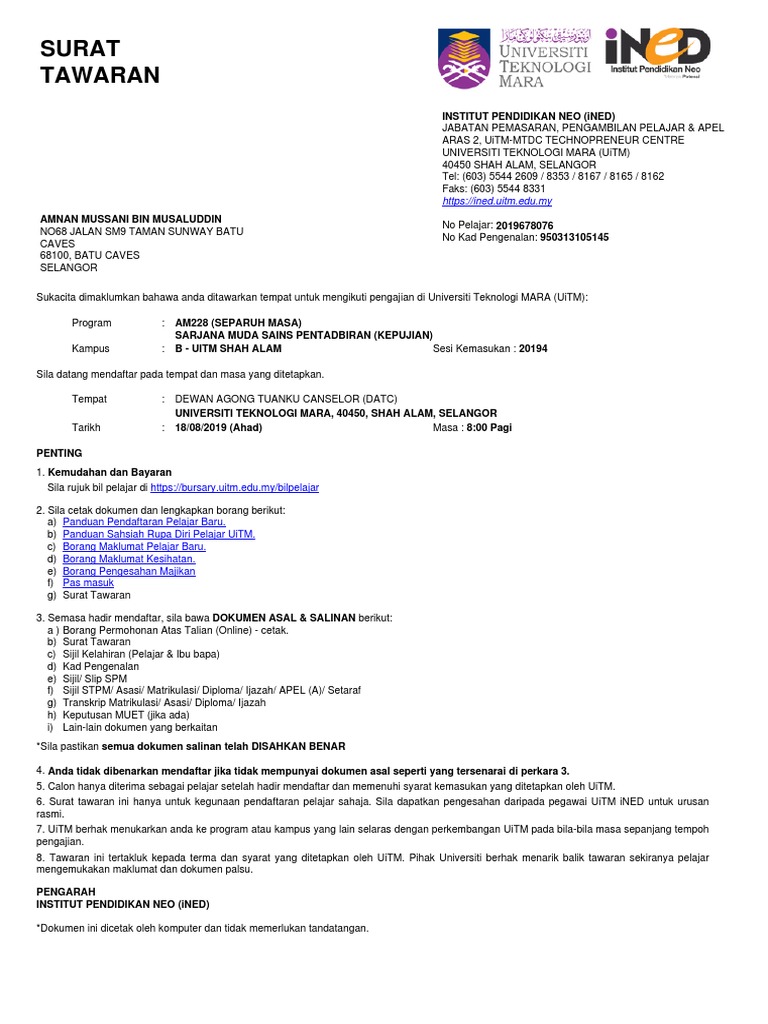 Surat Tawaran Uitm 2019 Braydencxt
